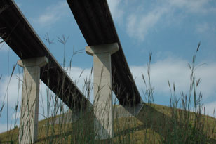 With the October 2000 award of a $16 million contract for the Rubles Run Bridge, only five projects remained to complete West Virginia’s four-mile segment of the Mon-Fayette Expressway (WV 43), the four-lane highway linking I-68 near Cheat Lake with southwestern Pennsylvania near Pittsburgh. Adjoining a completed 2.08-mile segment, the bridge built by National Engineering & Contracting Company of Strongsville, Ohio, used federal funds made available by Senator Robert C. Byrd to continue progress on the expressway. The six-span fabricated steel girder used 5,387,547 pounds of structural steel to carry the Mon-Fayette roadway over Rubles Run and included a small amount of paving in Pennsylvania on the northern approaches of the 0.39-mile project.